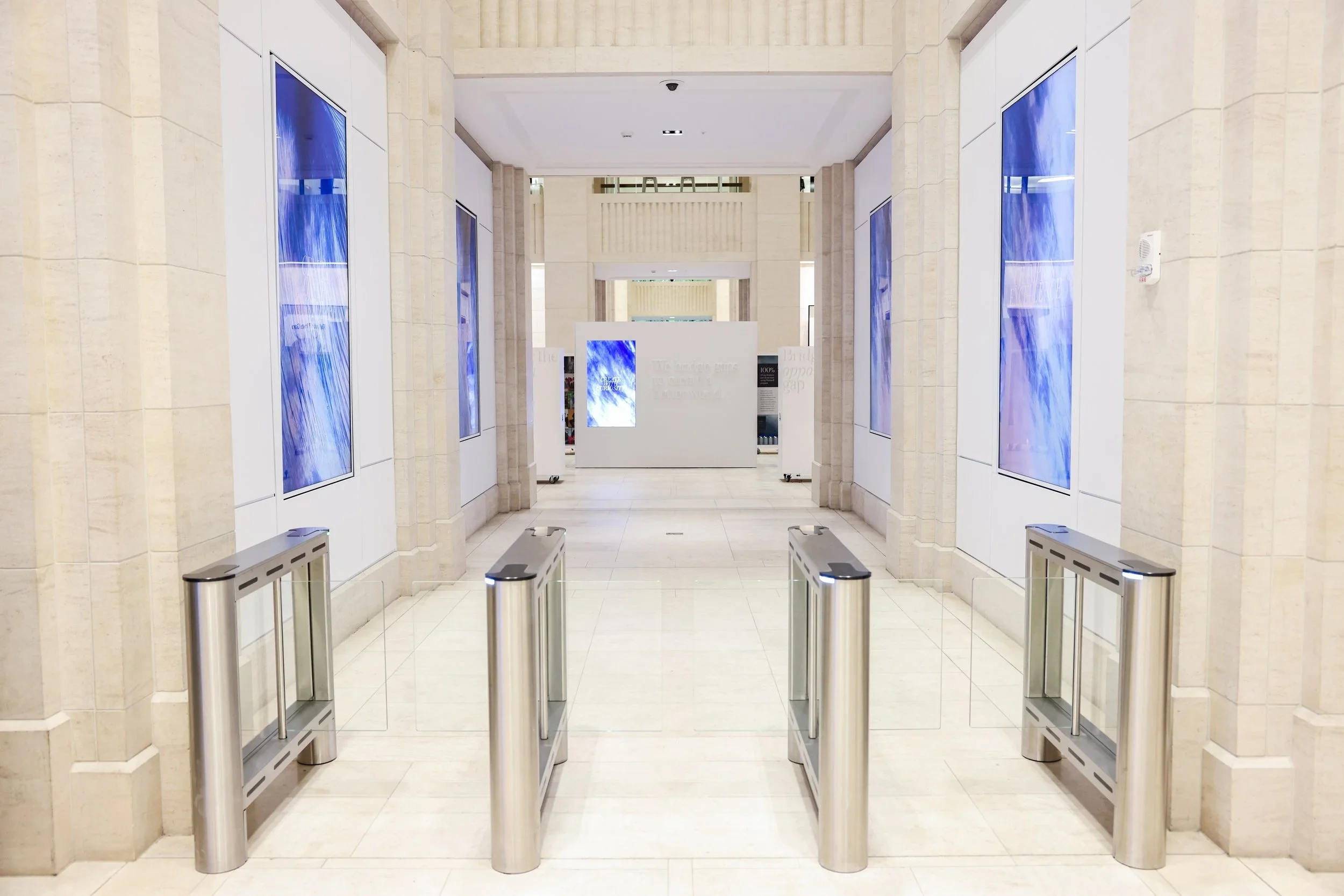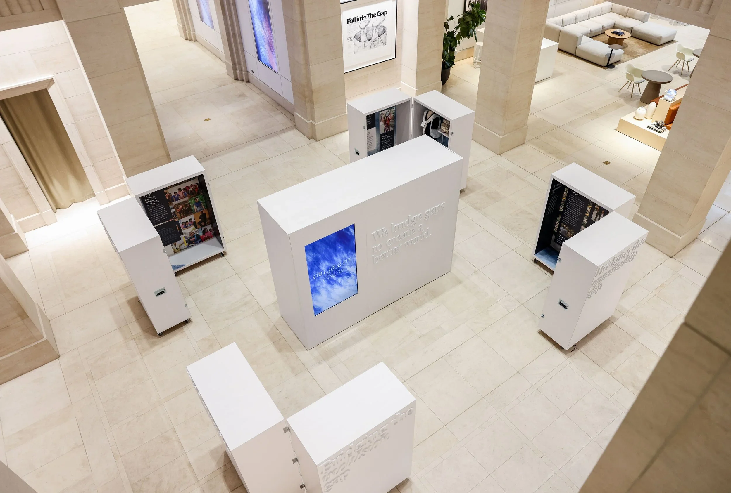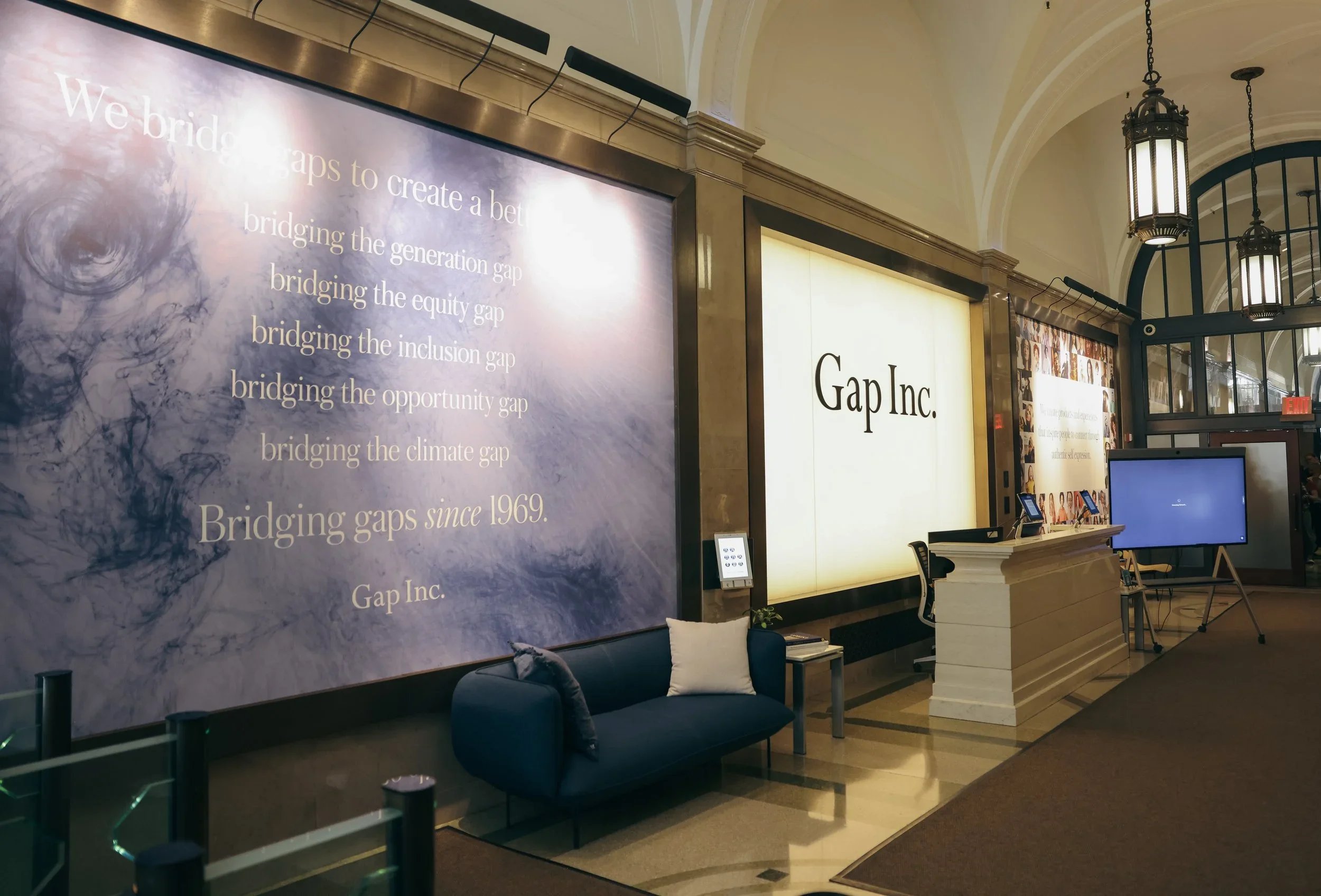 Impact “pillars” brought to life in the lobby of the Gap Inc. Headquarters at 2 Folsom in San Francisco, paired with a video takeover in the lobby.